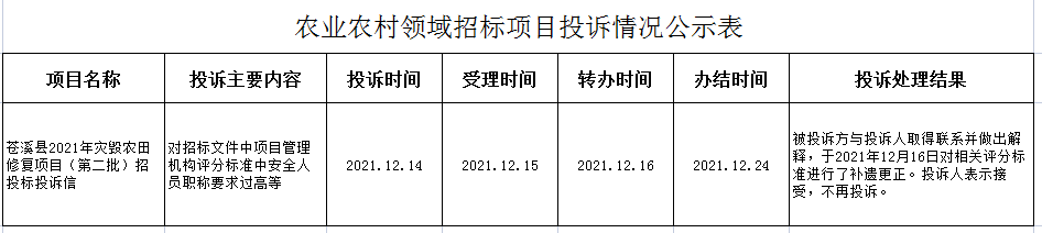 農(nóng)業(yè)農(nóng)村領(lǐng)域招標(biāo)項(xiàng)目投訴情況公示表
