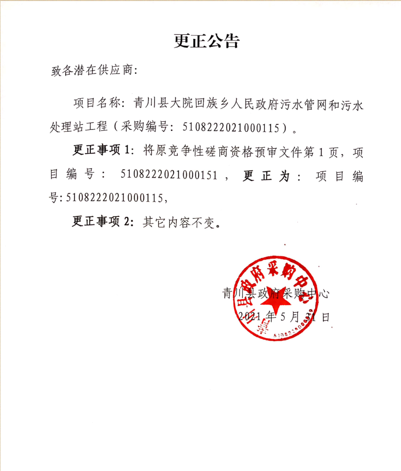 青川縣大院回族鄉(xiāng)污水管網和污水處理站工程[變更公告]