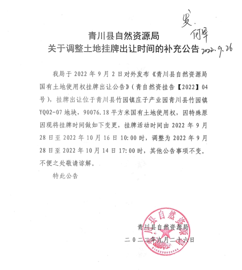 青川縣自然資源局關(guān)于調(diào)整土地掛牌出讓時(shí)間的補(bǔ)充公告