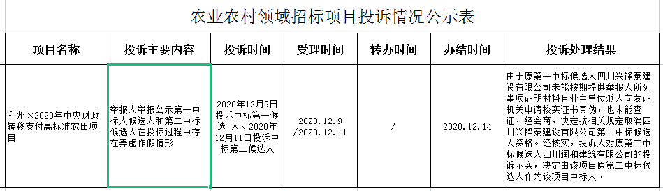 農(nóng)業(yè)農(nóng)村領(lǐng)域招標(biāo)項(xiàng)目投訴情況公示表