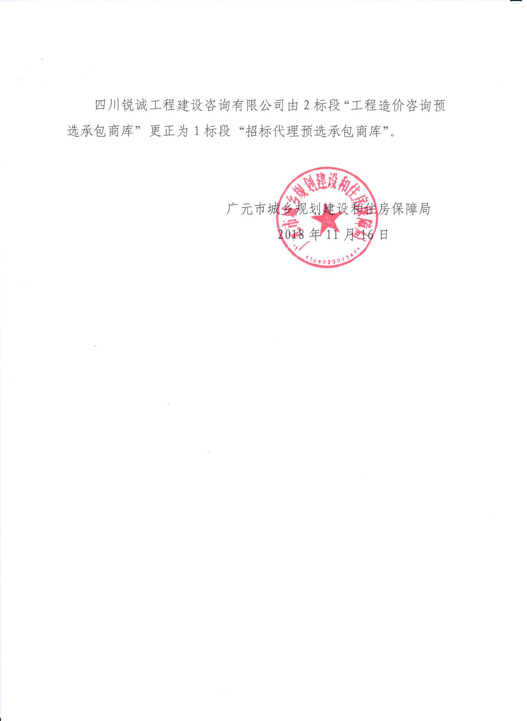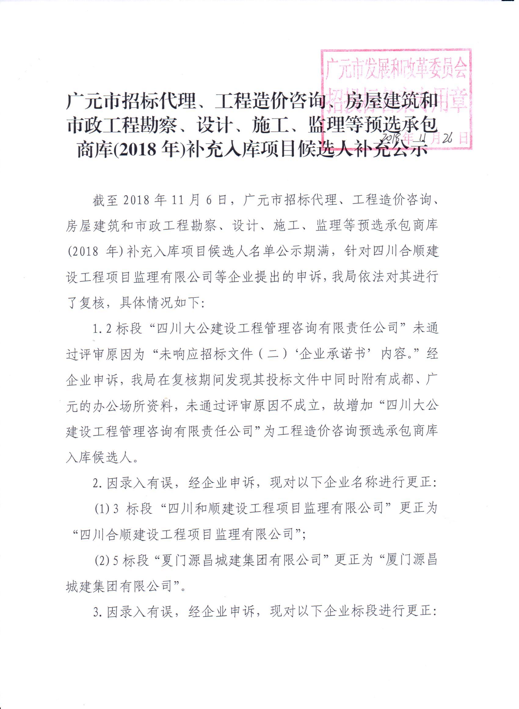 廣元市招標代理、工程造價咨詢、房屋建筑和市政工程勘察、設計、施工、監(jiān)理等預選承包商庫(2018年)補充入庫項目候選人補充公告