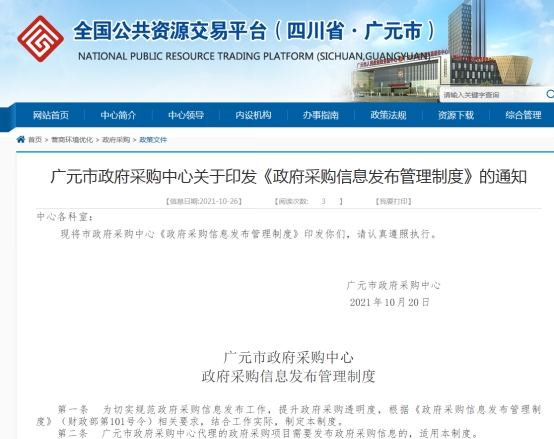 今年以來,廣元市政府采購中心通過健全工作機制、完善平臺建設(shè)、強化信息發(fā)布等措施,持續(xù)推進(jìn)政府采購信息公開,不斷提升政府采購?fù)该鞫取?/font>